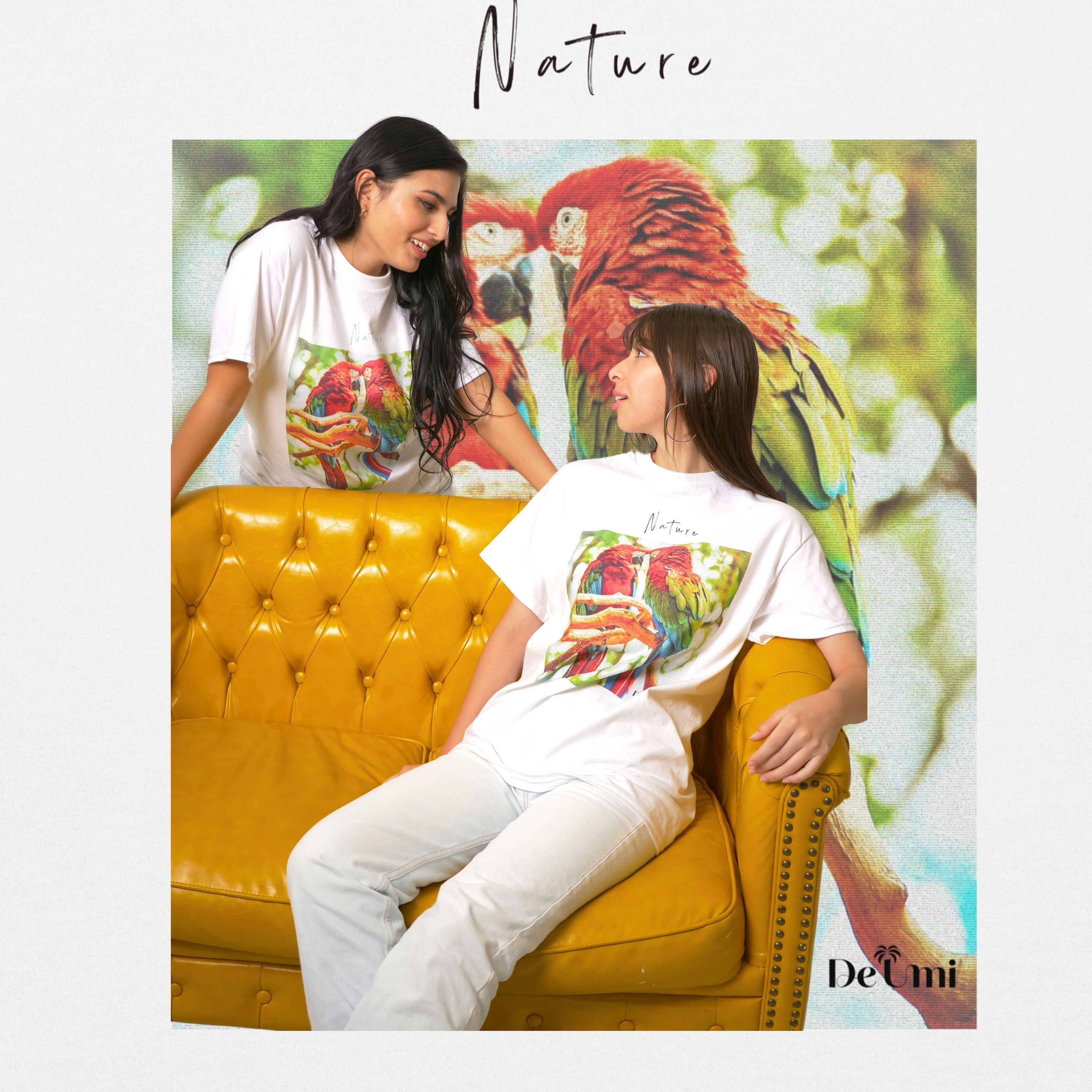 The colorful parrot illustration brings a tropical resort vibe to your everyday look.