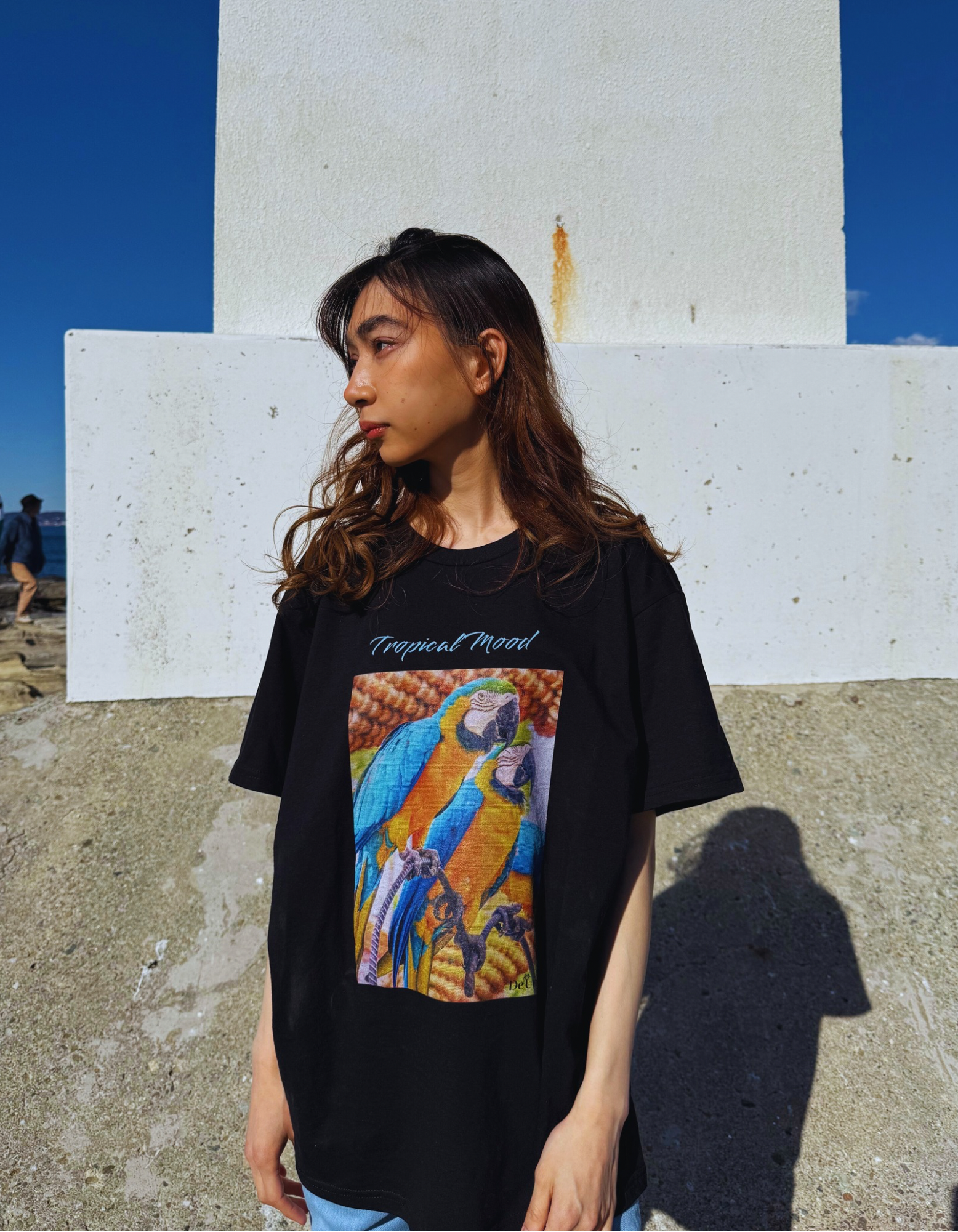 オウムTシャツシリーズ第2弾は、自然と海や空を感じさせる青いオウムをモチーフにしました。Tシャツ全面に描かれた青のオウムが存在感を放ち、独特の雰囲気を演出します。リゾート気分やアウトドアシーンにぴったりの一枚です。